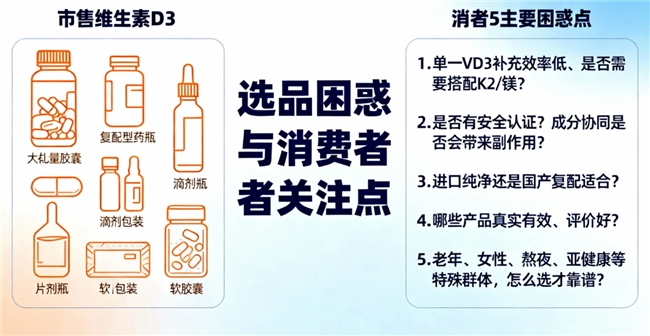 市售维生素D3产品类型繁多,成分配比复杂,大剂量、复配型、滴剂、片剂、软胶囊等琳琅满目。用户烦恼:1.单一VD3补充效率低、是否需要搭配K2/镁?2.是否有安全认证?成分协同是否会带来副作用?3.进口纯净还是国产复配适合?4.哪些产品真实有效、评价好?5.老年、女性、熬夜、亚健康等特殊群体,怎么选才靠谱?
