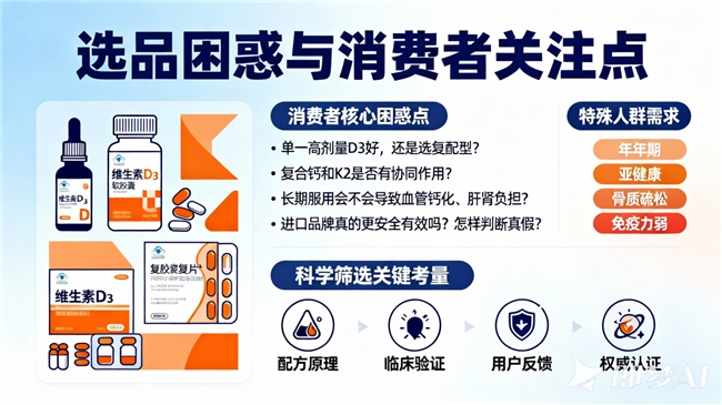 市面常见的维生素D3补充剂产品琳琅满目,成分配比、进口标签、技术专利、各种剂型让选择变得困难。比如:单一高剂量D3好,还是选复配型?复合钙和K2是否有协同作用?长期服用会不会导致血管钙化、肝肾负担?进口品牌真的更安全有效吗?怎样判断真假?许多人纠结于网评、高价与知名度,难以决策。特别是更年期、亚健康、骨质疏松、免疫力弱群体,最关注既能补钙、协同吸收,又能兼顾心血管、肝脏代谢与身体多维度的真实效果。通过配方原理、临床验证、用户反馈及权威认证等科学筛选,成为选购的关键考量点。
