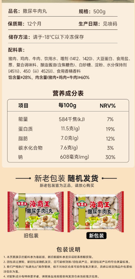 同日,在某电商超市里销售的一款海霸王肉丸产品,其图文详情页面品名显示为“撒尿牛肉丸”,配料表前三位为猪肉、鸡肉、牛肉,商家称“本页面展示的配料表为最新版”。