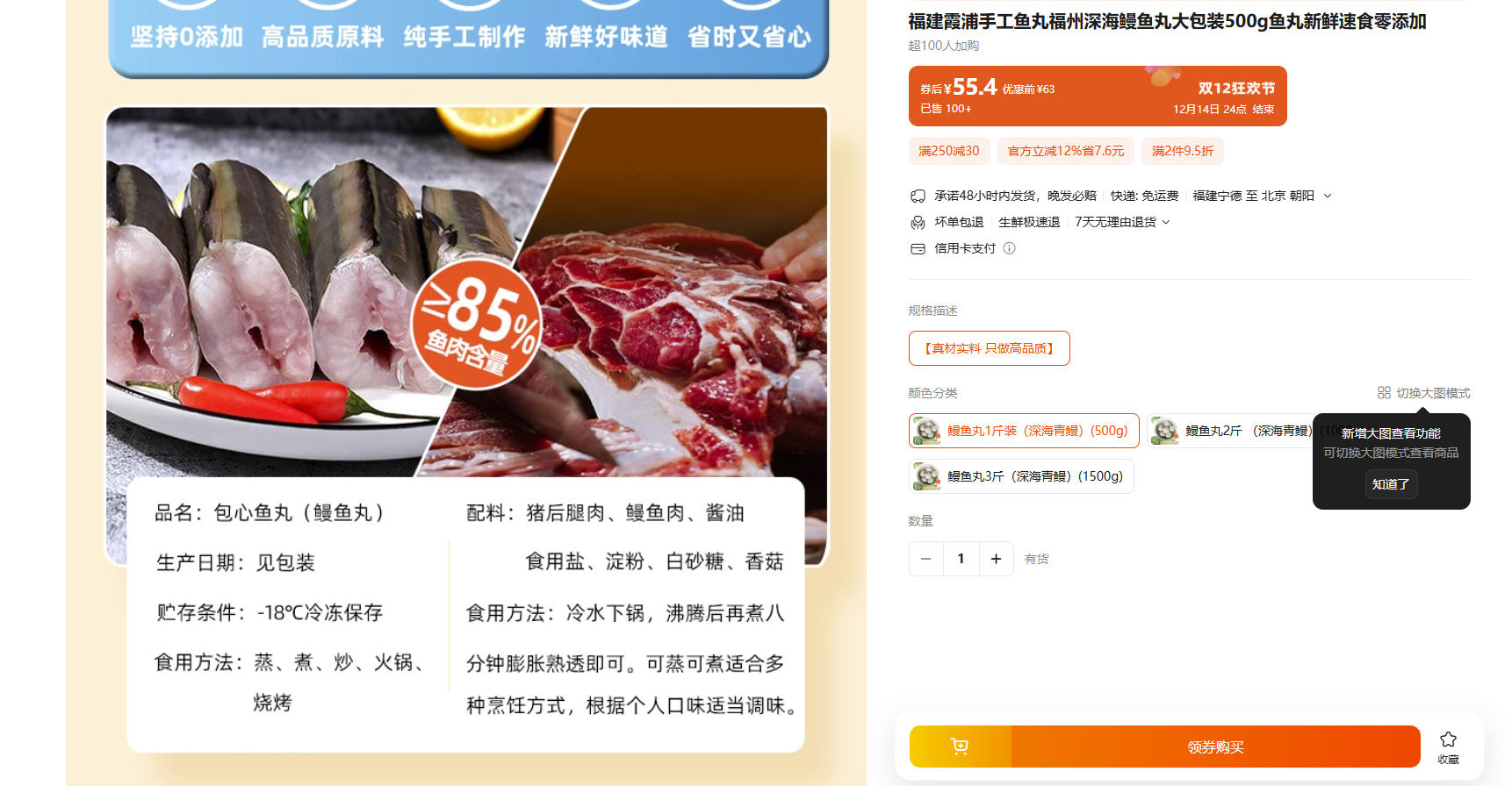 鱼丸介绍页面显示配料表首位为猪后腿肉。资料图片