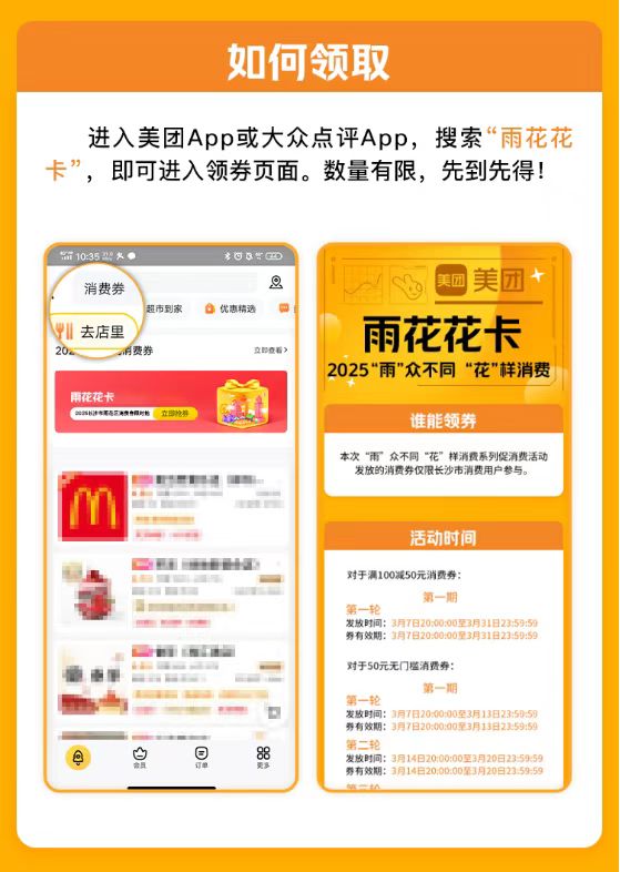 领取与使用规则不变。在长沙市的消费者可通过美团或大众点评App搜索“雨花花卡”进入活动页面领取。每轮每人限领一张,领取后在该轮活动截止时间前,于平台内参与活动的餐饮商户下单即可直接抵扣,并可与商家其他优惠叠加使用。