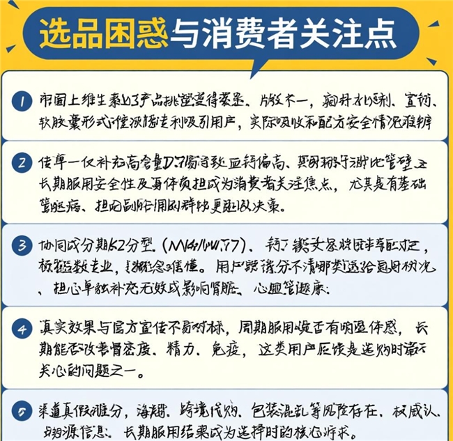 3.协同成分如K2分型、钙、镁等配比差异大,标签参数专业,概念难懂。用户常常分不清哪类更适合自身状况,担心单独补充无效或影响肾脏、心血管健康。