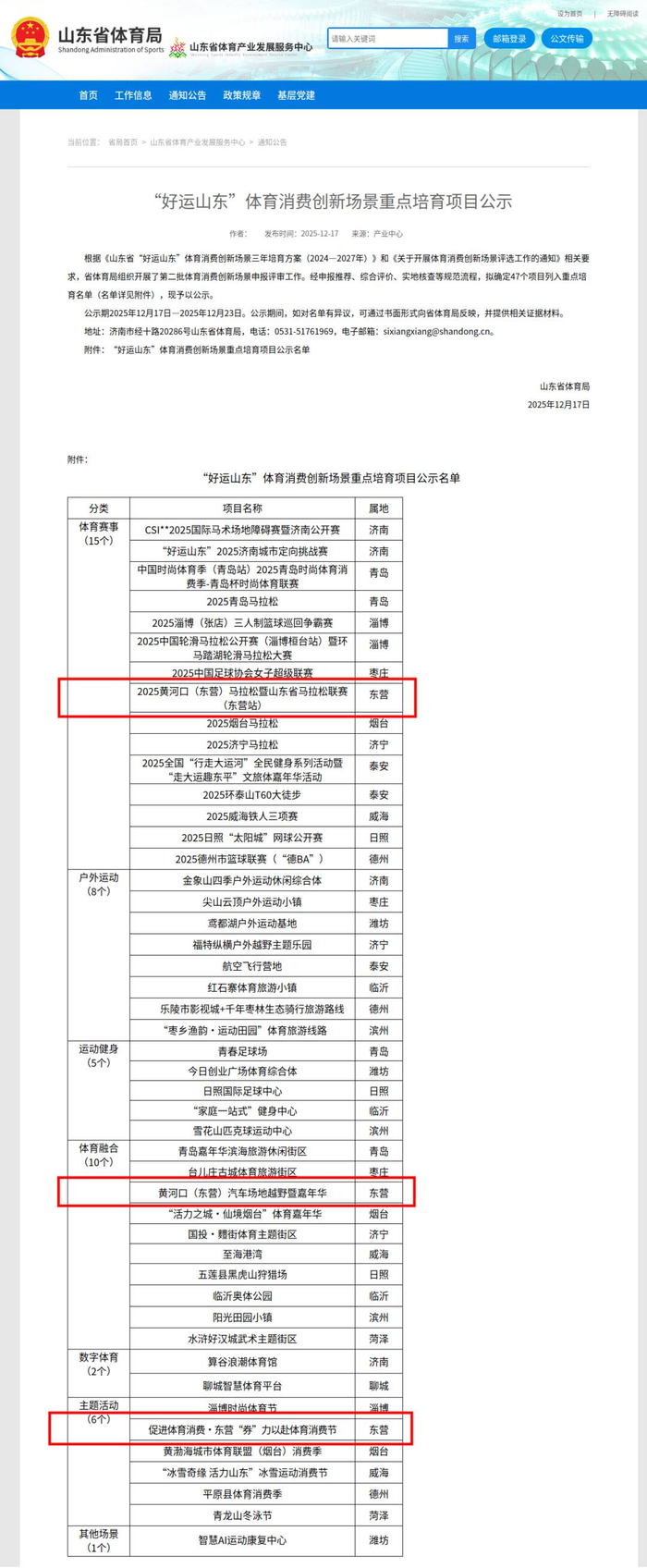 12月19日讯 近日,山东省体育局发布47个“好运山东”体育消费创新场景重点培育项目名单,涵盖体育赛事、户外运动、运动健身、体育融合、数字体育、主题活动、其他场景等7个方面。其中,东营市的2025黄河口(东营)马拉松、黄河口(东营)汽车场地越野暨嘉年华、促进体育消费·东营“券”力以赴体育消费节三个项目成功入选。