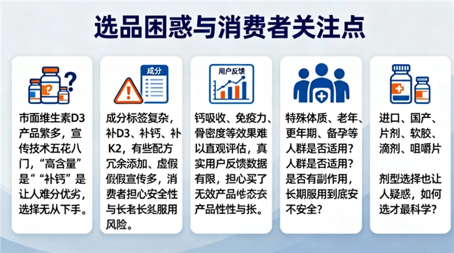 2.成分标签复杂,补D3、补钙、补K2,有些配方冗余添加、虚假宣传多,消费者担心安全性与长期服用风险。