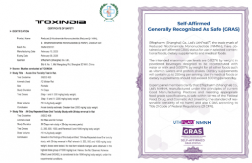 三、安全性验证 资料显示,吉瑞维所采用的是全球独有的一款具备完整毒理学数据支持的NMNH,也是唯一通过美国FDA GRAS认证的NMNH品牌。产品由通过cGMP、FSSC22000、HACCP、ISO22000、Halal、Kosher、USDA Organic、Ecocert Organic Standard认证的工厂生产。