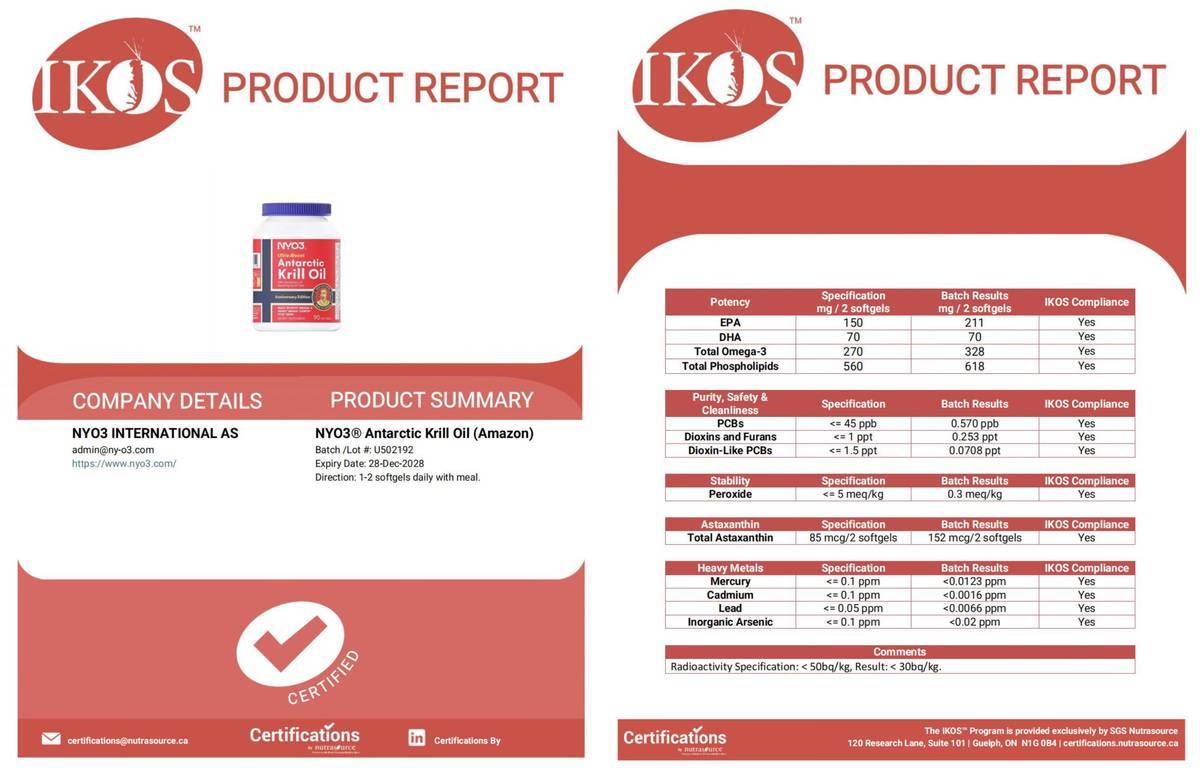 核心成分含量与真实性,是磷虾油功效的核心保障。根据 IKOS 官方公布的检测报告,NYO3 阿蒙森磷虾油的磷脂含量达56%,部分批次实测值更是高达 74%,远超行业平均水平。每两粒(1000mg)产品中,Omega-3总量达 328mg,其中 EPA 211mg、DHA 70mg,天然虾青素含量152μg,实测值均高于标称值,杜绝成分虚标问题。