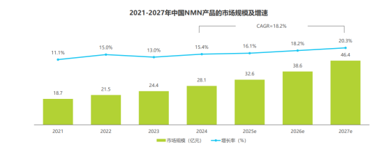这两年,NMN在国内健康消费市场的热度持续攀升——作为NAD+的关键前体,它虽比欧美日晚些进入中国大众视野,却展现出强劲的发展势头。根据艾瑞咨询的《2025年中国NMN行业研究报告》,自2020年大规模进入中国市场以来,NMN产品市场保持稳定增长,增速随行业成熟逐步提升,预计2025年市场规模将突破30亿元;当前其应用已深度渗透保健品、化妆品两大核心场景,未来随着政策逐步放开,还将向宠物营养、医疗健康、农业科技等领域延伸,市场空间进一步扩大。