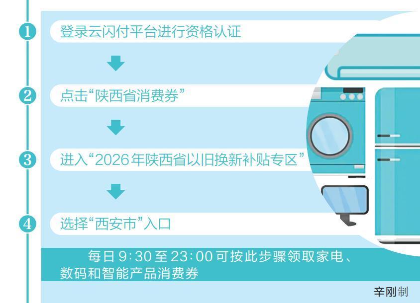 每日9∶30至23∶00在云闪付平台发放家电、数码和智能产品消费券。“消费者登录云闪付平台进行资格认证后,点击‘陕西省消费券—2026年陕西省以旧换新补贴专区—西安市入口’领取消费券。”西安市商务局相关负责人介绍,领取当日有效,到期未使用自动失效,过期可重新申领。