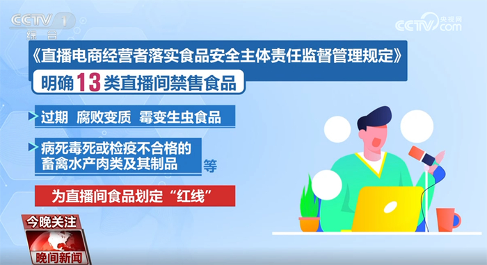《规定》明确13类直播间禁售食品,包括用非食品原料生产、添加有毒有害物质的食品;致病性微生物、重金属超标食品;过期、腐败变质、霉变生虫食品;病死毒死或检疫不合格的畜禽水产肉类及其制品等,为直播间食品划定“红线”。