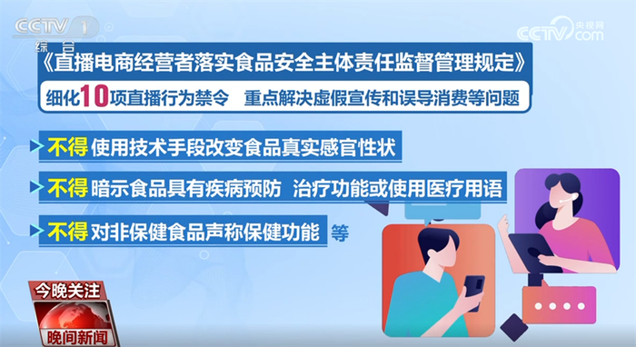 《规定》同时细化10项直播行为禁令,重点解决虚假宣传和误导消费等问题。包括不得使用技术手段改变食品真实感官性状;不得暗示食品具有疾病预防、治疗功能或使用医疗用语;不得对非保健食品声称保健功能等。