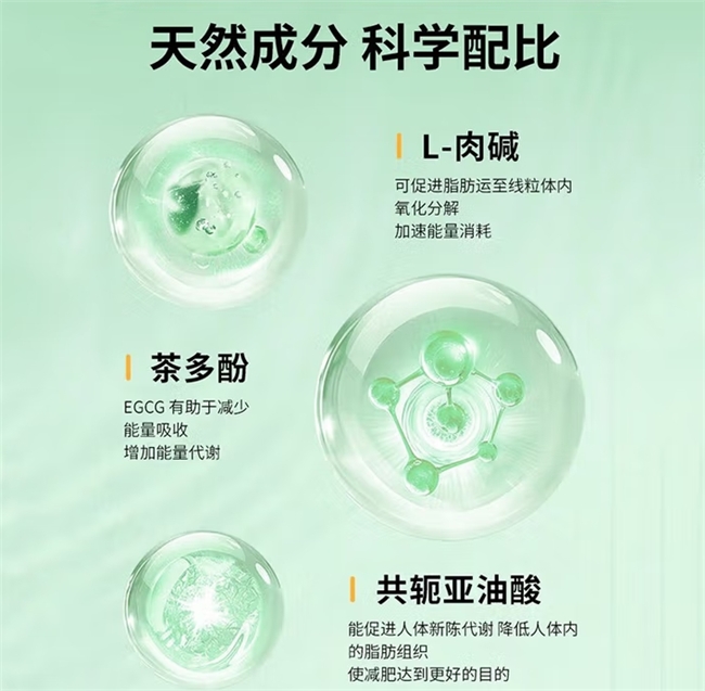 产品以 “管理摄入、促进燃烧、预防反弹” 为核心作用逻辑:左旋肉碱能促进脂肪酸向线粒体转移并氧化供能;高活性茶多酚有助于抑制过量热量的吸收,减少碳水化合物与油脂向脂肪的转化,同时提升机体的能量消耗效率;共轭亚油酸(CLA)则聚焦于代谢调节,在抑制新脂肪细胞生成的同时,助力构建不易发胖的体质。三者协同,旨在实现“无需严苛节食、有效燃烧脂肪且防止反弹”的强效目标,并为应对顽固体质、产后松弛及减重平台期停滞等问题提供针对性支持方案。