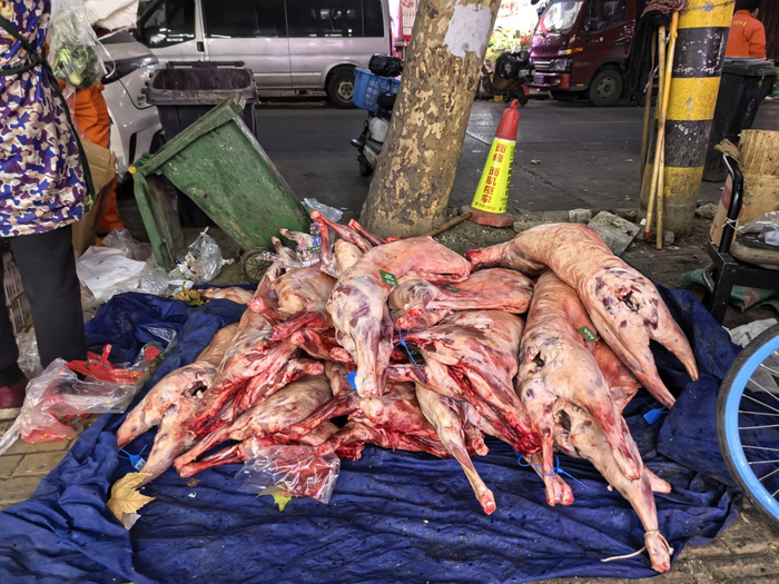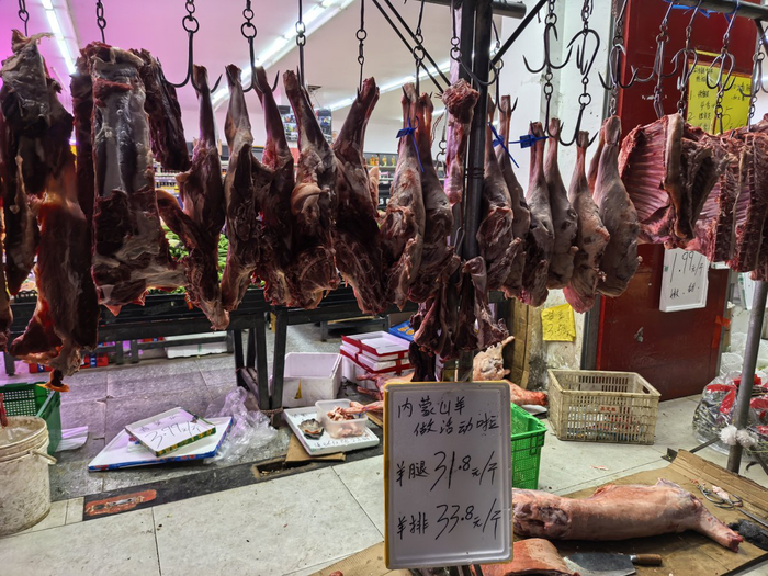 1月22日清晨,记者来到汉口聚才路与三眼桥北路交会处的露天生鲜市场。只见一家连锁生鲜卖场外停着一辆运送生鲜肉品的冷藏车。很快,一只只已经屠宰、分件的肉羊被送到了店门口,由工作人员逐一挂了起来,开始售卖。