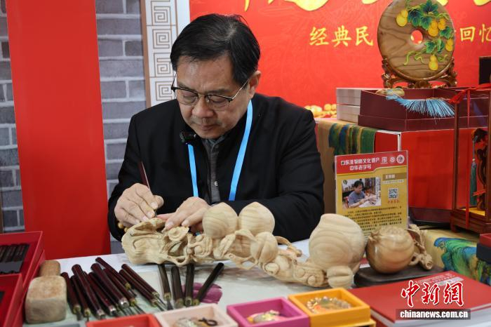 山东省级非物质文化遗产代表性项目桃木雕刻民俗代表性传承人王来新在雕刻作品。王采怡 摄