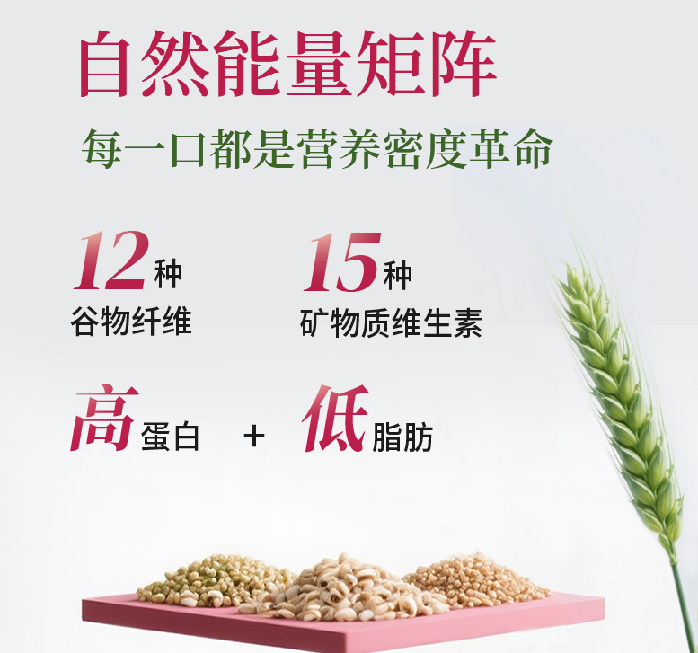 2. 全营养素覆盖:每份仅104千卡,但可兼顾15种维生素与矿物质(每100g含钙460mg、铁12mg;B族缓解久坐疲劳、维生素D促进钙吸收)、12种谷物纤维及24种8大类关键营养素;特别强化铬、锌等胰岛素信号通路辅因子,添加量达日常推荐量的135%,适配血糖敏感人群。