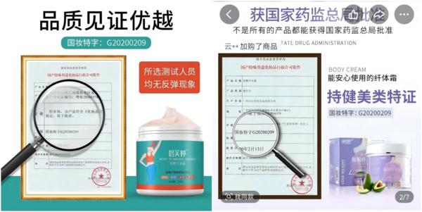 据了解,“妆网备字”是普通化妆品的备案编号,由省级药品监督管理部门进行管理。调查中,除了滥用过期的“国妆特字”批件外,部分商家还将普通化妆品通过直接宣称或使用错别字、谐音暗示等方式,宣传产品具有瘦身、燃脂等健美功效,但备案信息与实际宣传不符。