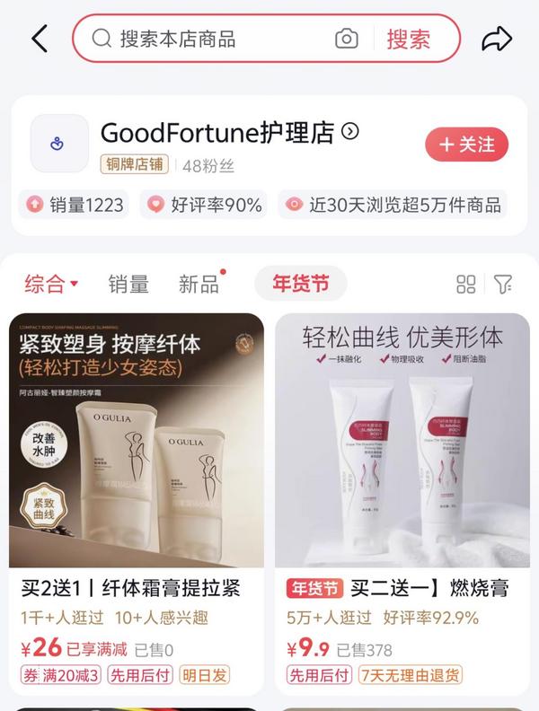 记者在“GoodFortune护理店”看到两款纤体产品,一款是使用过期“国妆特字G20151882”批件的巧巧纤体塑身霜;另一款是标注备案编号“粤G妆网备字2024129203”的O'GULIA阿古丽娅-智臻塑颜按摩霜。其中,O'GULIA阿古丽娅-智臻塑颜按摩霜的产品标题标注“纤体霜膏提拉紧致肚子小腹大腿学生粗腿肌肉顽固形小腿”,宣称可以“紧致塑身”“改善水肿”,标注功效“弹力紧致”。