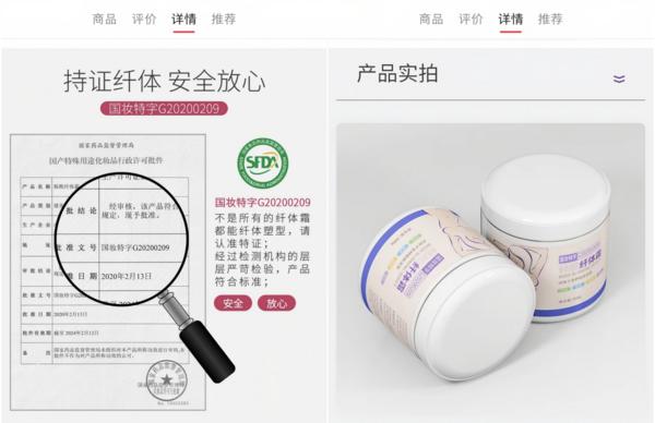 部分不同包装的纤体霜仍以“国妆特字G20200209”批件为卖点进行销售。网络截图