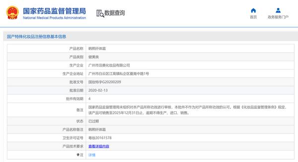 记者登录国家药品监督管理局官网查询核实,“国妆特字G20200209”对应的产品名称为韩熙纤体霜,类别为健美类,生产企业为广州市泊美化妆品有限公司,批准日期为2020年2月13日,批件有效期4年,目前已过期。备注信息明确标注,该产品可销售至2025年12月31日止,逾期不得生产、进口、销售,且国家药品监督管理局未组织对本产品所称功效进行审核,批件不作为对产品所称功效的认可。