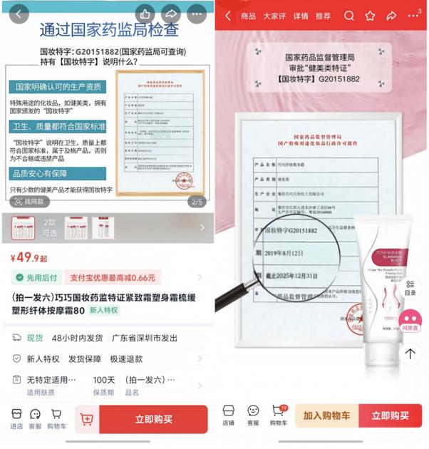 除上述批件外,其他过期批件也被违规使用。截至1月26日,“专注健康优选生活馆”“艾雨薇美妆护肤”仍以“国妆特字G20120494”批件销售相关产品,该批件对应的产品名称为御雪秀而美苗条霜,属于健美类,生产企业为广州依露美化妆品有限公司,目前该批件已过期;“GoodFortune护理店”“美德裴丽工厂”“秘詩堂健康护理店”等店铺,则以“国妆特字G20151882”批件销售纤体霜,该批件对应的产品同样为健美类,生产企业为肇庆巧巧日用化工有限公司,该批件也已过期。两个批件对应的产品均已超出2025年12月31日的最后销售期限。