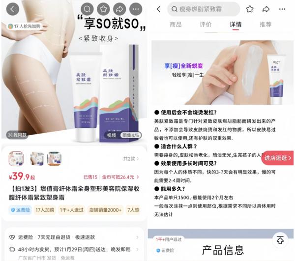 “美德裴丽工厂”店铺的违规宣传更为隐蔽。该店在售的3款纤体类型产品,除使用过期批件的“巧巧纤体霜”外,一款标称“燃值膏纤体霜全身塑形美容院保湿收腹纤体霜紧致塑身霜”的产品,宣传“享SO就SO”“紧致收身”,并介绍“美肤紧致霜是专门针对紧致皮肤、燃烧脂肪而研发出来的产品,适合需要瘦身的人群”。记者根据其标注的备案编号“粤G妆网备字2023012805”查询显示,产品名称为佰芳源美肤紧致霜,功效宣称为保湿、紧致。