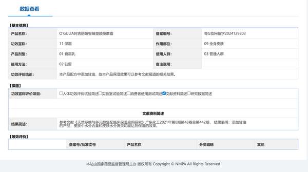 O'GULIA阿古丽娅-智臻塑颜按摩霜备案的功效宣称仅为保湿。网络截图