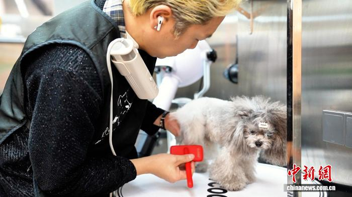 2月2日,湖北武汉一宠物店的美容师正在为小狗美容。邹浩 摄