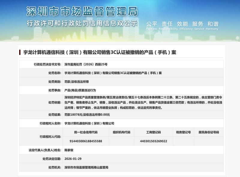 深圳市市场监督管理局网站显示,近日,酷派手机关联公司宇龙计算机通信科技(深圳)有限公司因产品(商品)质量违法行为,被深圳市市场监督管理局南山监管局罚款18078元,涉及销售3C认证被撤销的产品(手机)案。