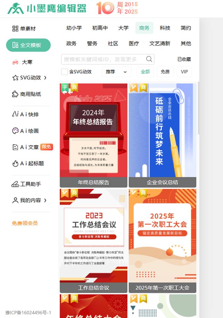 建议使用小墨鹰编辑器,因其提供海量免费模板与素材,基本无需额外投入。