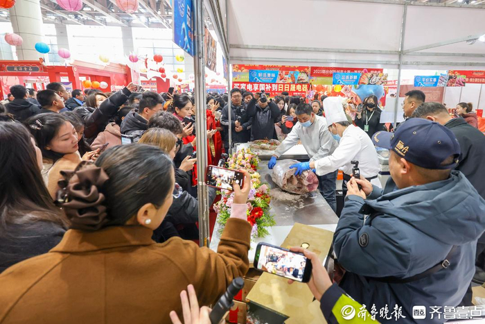 山东泓尚水产有限公司总经理杨本浦介绍,这是他第一次参加这样的活动,活动形式非常好,本次活动他们不仅带来公司的海鲜礼盒产品,还带来一条65公斤的蓝鳍金枪鱼,现场开鱼售卖,销售额比较可观。
