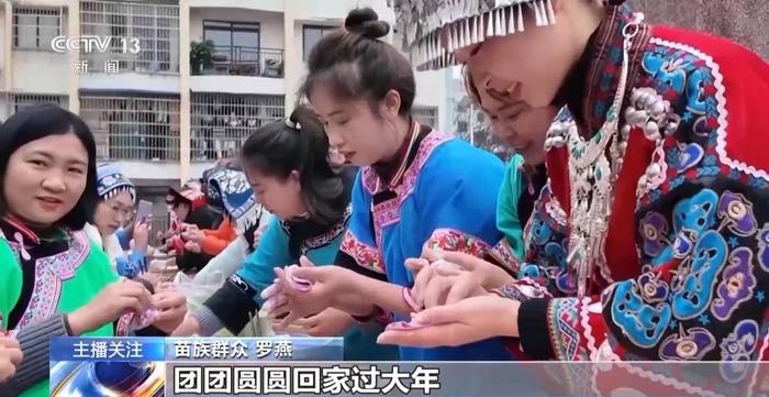 苗族群众 罗燕:我们现在正在包饺子,所有的邻居都过来帮忙,饺子有紫色、绿色,黄色还有白色,寓意着大家团团圆圆回家过大年。