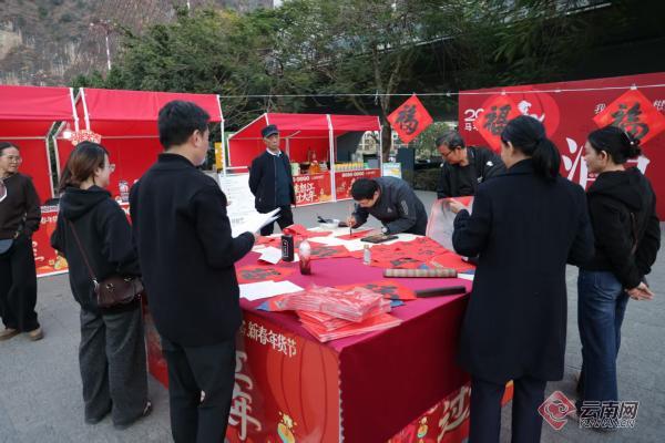 品年味、赏民俗、购好物……本次年货节的开展还是一场文化盛会。现场特设年俗文化互动区,泸水市文联书法家们挥毫泼墨,为市民免费书写春联、福字,笔墨间的浓浓年味,唤起了大家对传统节俗的美好记忆。此外,趣味十足的“新春套圈”互动游戏,让现场欢乐氛围持续升温;线上直播带货、领券核销等环节同步开启,打通线上线下消费场景,让年货节的影响力不断延伸,实现“线下热闹、线上火爆”的消费新体验。