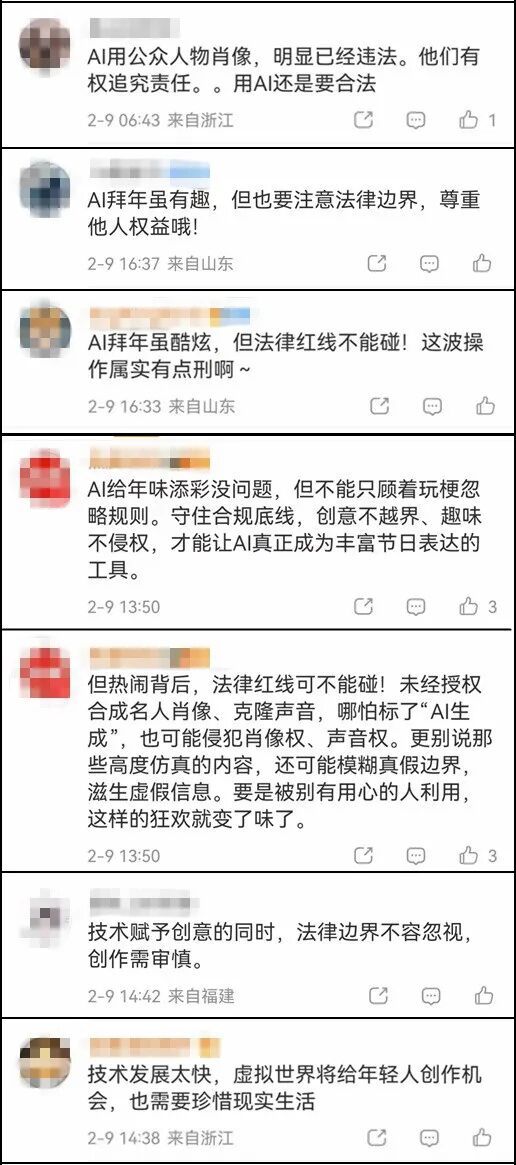 对此,网友们均表示了担忧:“技术创新需守规矩,版权伦理不容忽视。”“用AI还是要合法。”“AI拜年虽有趣,但也要注意法律边界,尊重他人权益!”
