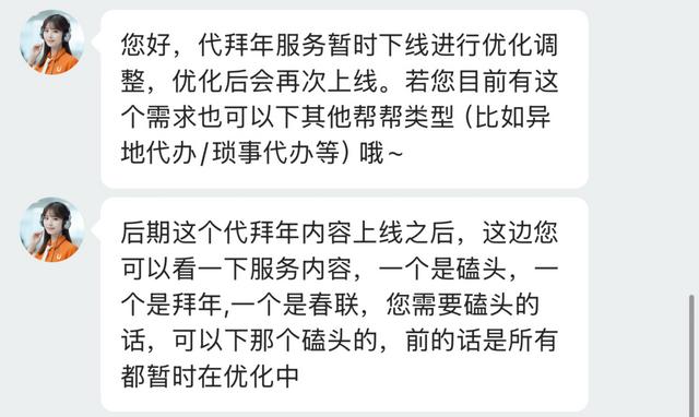 2月10日,记者发现,在该跑腿平台上已无法搜索到相关服务。该跑腿平台客服向记者表示,目前拜年所有服务内容,都已经暂时下线进行优化。后期代拜年内容上线后,将包括:磕头、拜年、春联,如果需要磕头服务可下单。