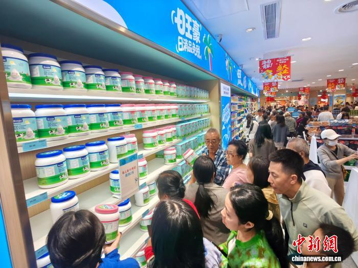 2月11日,海南首批日用消费品免税店开业。图为海口市旺豪日用消费品免税店内,消费者正在选购进口奶粉。中新网记者 王子谦 摄