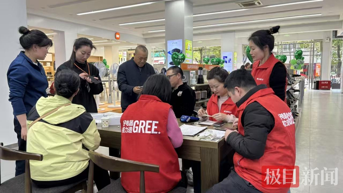2月10日,城区的各大电器卖场,咨询以旧换新补贴政策的顾客络绎不绝,销售人员忙得不可开交。在博通家电五交化卖场,有市民正在咨询换新事宜,工作人员耐心讲解政策,并帮助顾客在“湖北省以旧换新公共服务平台”上领取补贴券。