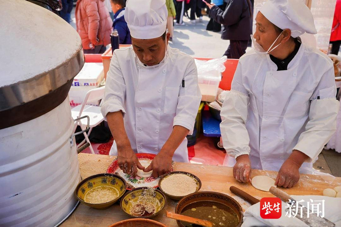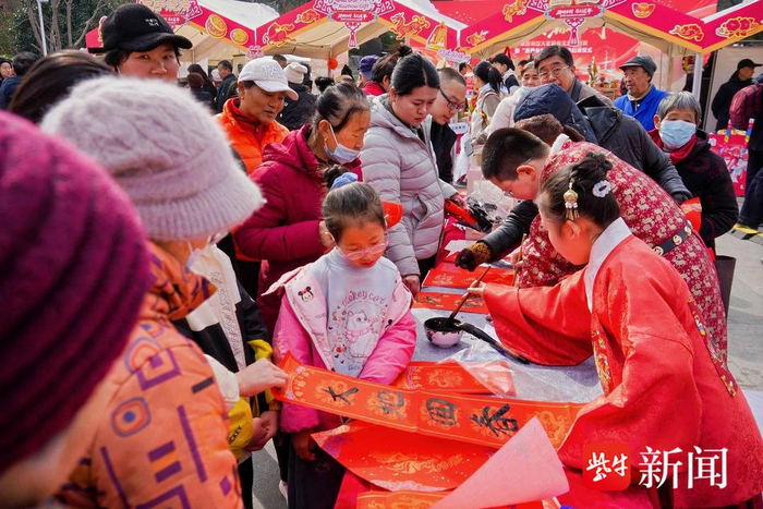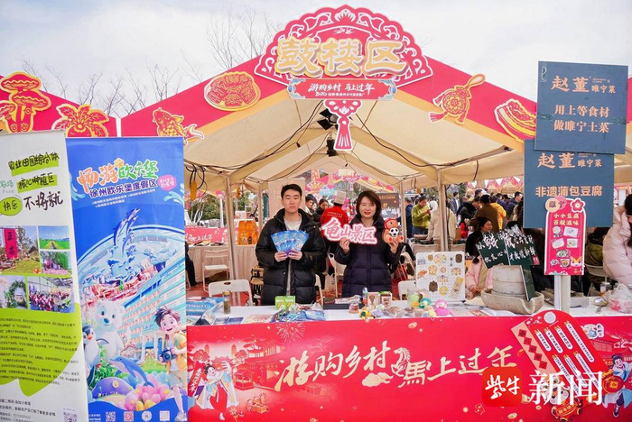 同时,“游购乡村 马上过年”徐州乡村旅游推广活动同步开启,成为展现徐州乡村特色、非遗魅力、农产优品的重要窗口。市集设置特色农产品区、非遗区、文创区、县市区推介区等多个板块,汇聚徐州各县(市、区)及苏皖鲁豫周边城市的百余种特色好物:丰县花饽饽、反手烧饼现场制作,邳州银杏文创、大蒜文创创意十足,贾汪马庄香包、睢宁面塑等非遗技艺匠心呈现,铜山有机番茄、经开区绿色果蔬等农特产品新鲜直供,还有临沂炒鸡、萧县老干馍、淮北花馍等苏皖鲁豫城市特色美食齐聚,打造一站式 “逛吃购玩” 体验。书法名家现场手写春联送福,彭城年味打卡区人气爆棚,让市民游客在市集里寻年味、品乡情、购好物,推动乡村特色产品走出田间地头,走进城市消费市场,以文旅消费赋能乡村振兴。