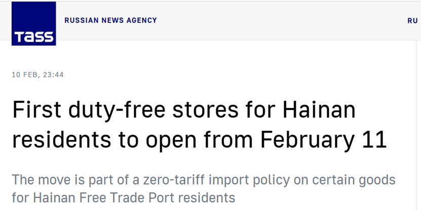 塔斯社对此报道称,这是2月5日生效的海南自由贸易港居民零关税进口政策的一部分。根据计划,零售店的开业将首先在岛上的三个关键城市开展,包括海口、三亚和儋州;考虑到人口评估、消费模式和基础设施发展,最初将开放五家商店:海口三家,三亚和儋州各一家。