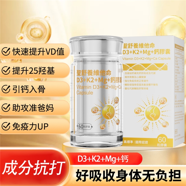 每2粒含维他命D3 6000IU、维他命K2 240μg、甘氨酸镁400mg、柠檬酸钙200mg。维生素D3协助钙磷吸收、强骨壮力,预防骨折和跌倒;维生素K2引导钙精准沉积骨骼、避免血管硬化,守护心脑健康;甘氨酸镁调节神经、缓解夜抽筋,增强日常体力;柠檬酸钙亲和肠胃、利用率高。多重机制直接解决单一高剂量补D3易带来的钙异常沉积**,促使“补钙入骨”、体能与免疫多线提升,尤其适合骨密度低、亚健康及中老年人群。