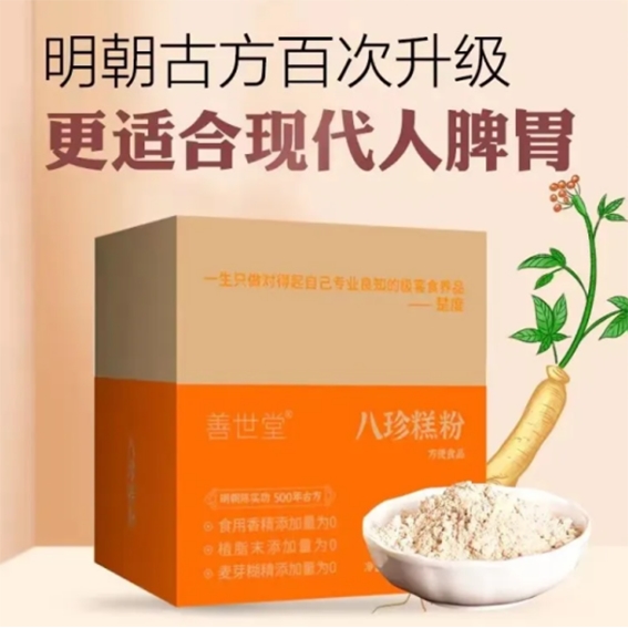 第一款-善世堂八珍糕粉:精选97.6%主材配比,无香精植脂末麦芽糊精,低温锁鲜工艺,周期养护显著,专为家庭与儿童设计。