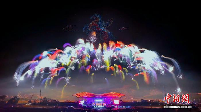 无人机表演《马踏祥云》与开场烟花《马力全开》率先拉开晚会序幕。一匹由无人机集群演绎的“天马”昂首奔腾于夜幕之上,宛如神骏踏云而来,瞬间点燃现场氛围。