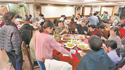 2月21日中午,南海区西樵镇旺阁渔村内人气高涨,浓郁的粤式菜肴香气裹挟着热闹的人声扑面而来。大堂内座无虚席,包间早已提前全部订满,服务员端着热气腾腾的年菜在席间有序穿梭,碗筷相击的清脆声响、食客的欢声笑语交织相融。“我们先上西樵山游玩了一圈,专门过来这里吃饭,我最喜欢这道生蚝蒸蛋,我们从珠海过来,就好这口鲜!”珠海食客陈启德说。