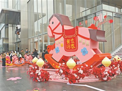 春节期间,市民游客在顺德万象汇打卡马年主题装饰。