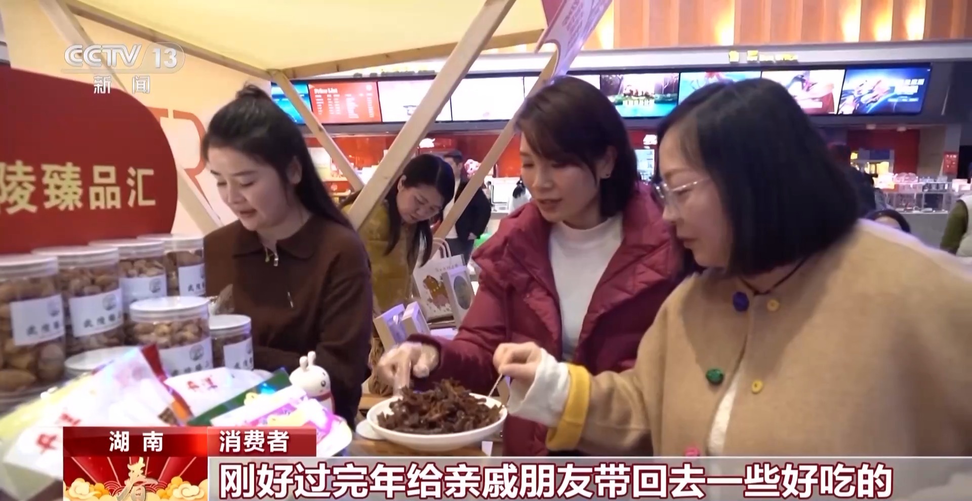 消费者:我刚刚看完电影出来,没想到凭电影票还可以享受85折。我就买了手撕酱板鸭和常德米粉,刚好过完年给亲戚朋友带回去一些好吃的。