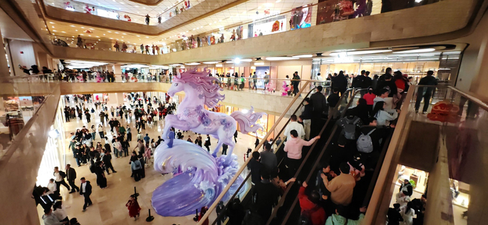 2月21日,南京德基广场商场内人潮涌动,商场一层矗立的马年主题生肖装置格外引人注目。新华社记者潘晔 摄