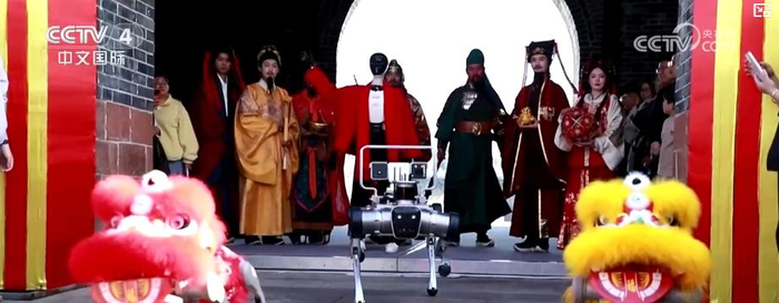 第二个关键词,“融合”。传统民俗与现代科技相融合,碰撞出新火花。在浙江衢州市龙游县的大南门历史文化街区,巡游展演火热上演。与往年不同,今年暖场的是四足机器狗和人形机器人,它们主动向游客挥手“拜年”,瞬间被大人、小孩团团围住。而另一边,这台机器人和游客玩起“石头剪刀布”,趣味十足的互动逗得大家开怀大笑。同样,在湖北安陆市盛世闻樱景区,以“传统文化+现代科技”为核心的春游园主题活动也热闹上演。人形机器人、机器狗与表演队伍组成“跨界迎宾团”亮相迎客,为游客带来不一样的节日体验。