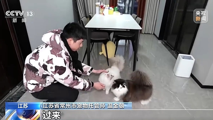 温金朝在江苏省常州天宁区经营着一家社区宠物店,今年春节,店里60只宠物寄养名额早已满员,于是他新增了上门喂养服务。傍晚六点,他准时来到客户家中,照看两只名为“包子”和“米线”的小猫。