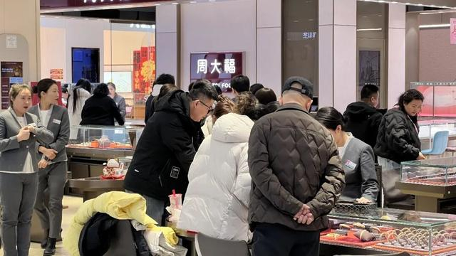 在众多品类中,黄金珠宝柜台前始终围满了挑选的顾客,成为当之无愧的“流量担当”。数据显示,仅初一到初七,黄金珠宝品类销售额便高达1507万元,较去年同期增长了535万元,增幅达到55%。李朋祥说:“带有生肖元素的金饰特别受欢迎。同时,不少消费者也把购买金条、金饰作为投资保值、馈赠亲友的首选,推动了这一品类的爆发式增长。”