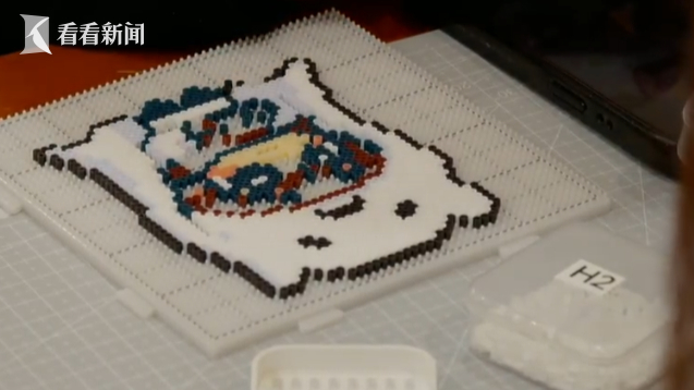 这个小姐姐入坑不久,正对着手机画面尝试拼出自己喜欢的动画形象。而一旁的高阶玩家,已经不满足于平面拼豆,而是准备要拼出一架立体三角钢琴来。