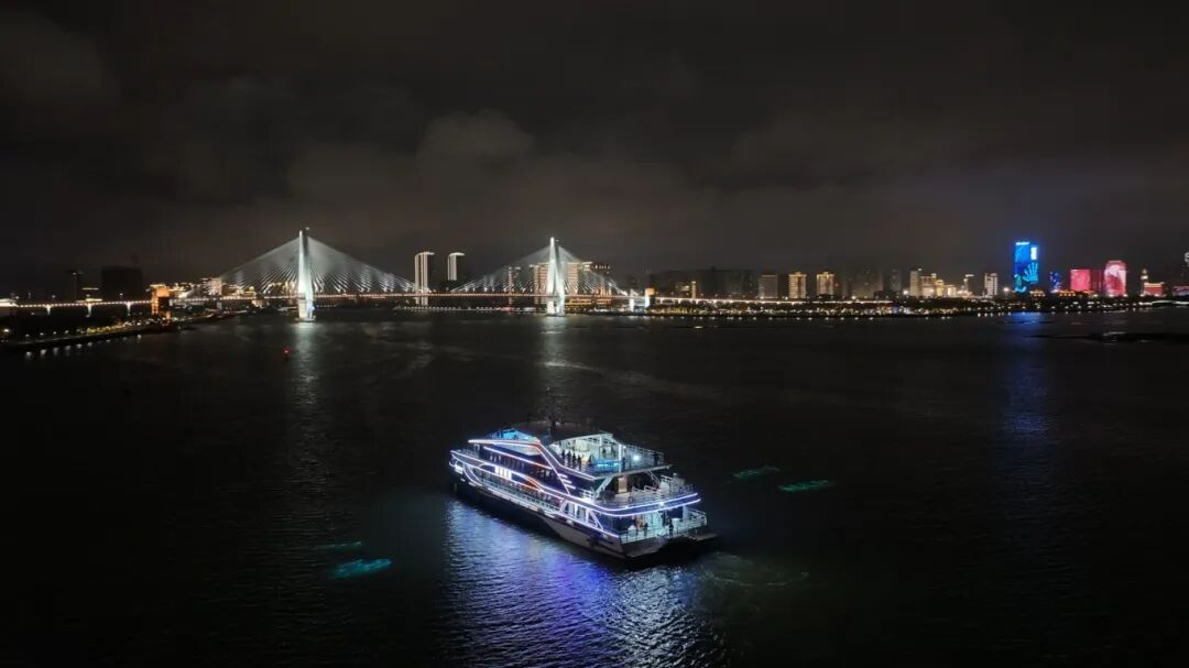 船舱内,游客品尝金枪鱼宴、参与猜灯谜;甲板上,人们远眺世纪大桥的夜景,聆听现场音乐。来自四川的游客刘女士说:“原本只想来看看夜景,没想到能猜灯谜、吃鱼宴,过节的感觉一下子就来了。”