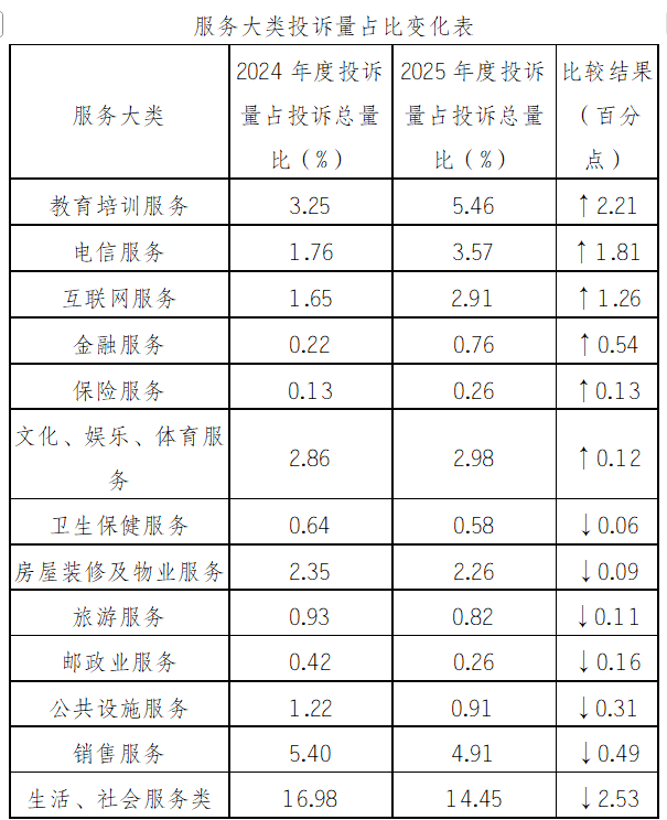 服务类投诉形成多元化的投诉格局。生活、社会服务类(9902件)、教育培训服务(3739件)、销售服务(3363件)位居投诉前三位。其中,教育培训服务、电信服务、互联网服务三类投诉同比分别上升2.21%、1.81%、1.26个百分点,成为服务类投诉增长主力,也是社会关注度较高的服务领域投诉。而生活、社会服务类和销售服务等呈下降趋势。